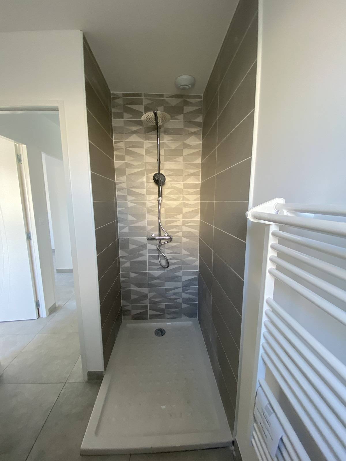 2 chambres avec emplacement placard. Salle de bains équipée et faïencée avec meuble vasque, miroir éclairé, receveur douche et sèche-serviettes.