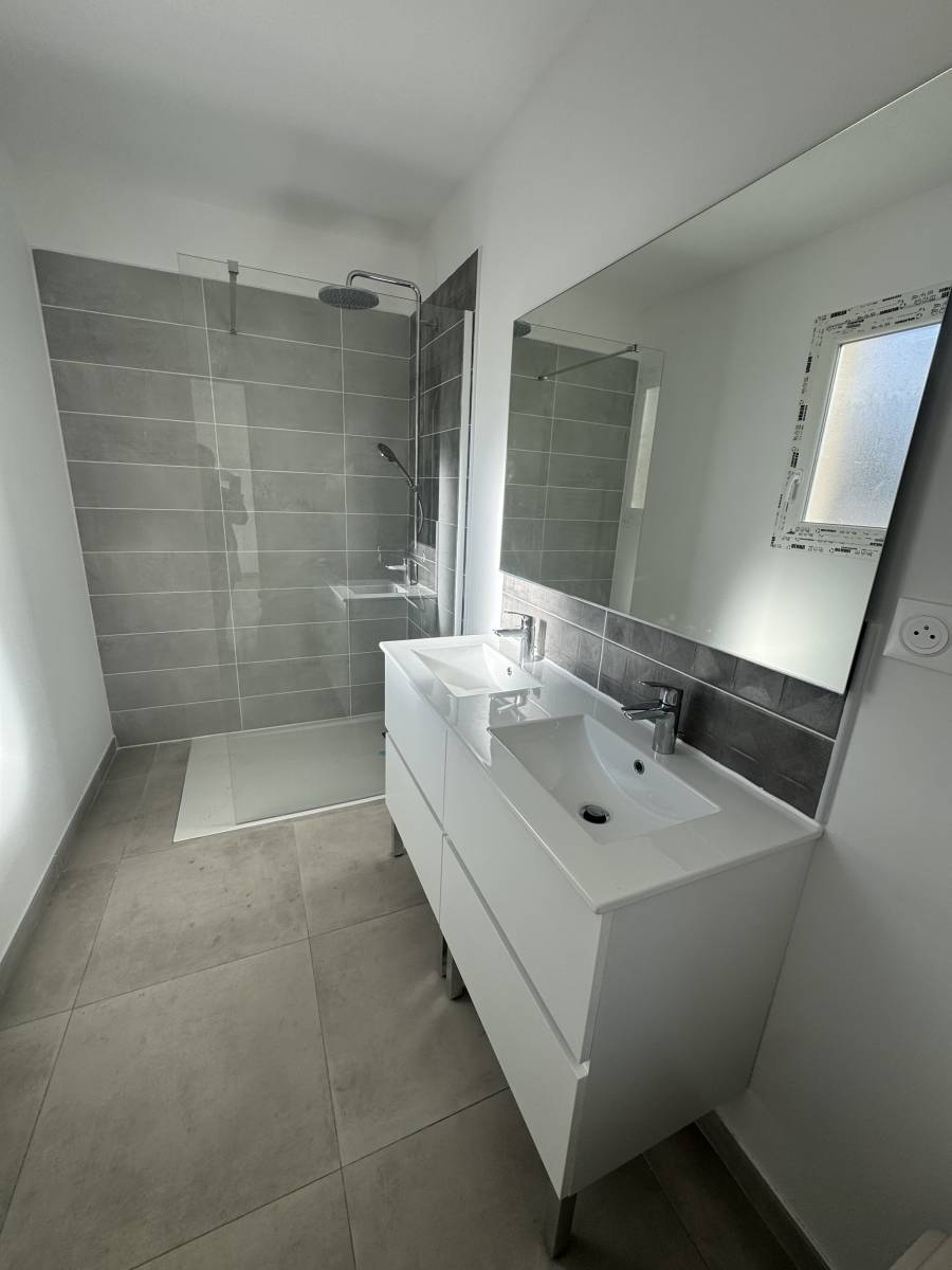 A l'étage, 2 belles chambres, une Salle d'eau équipée faïencée comprenant un receveur douche extra-plat encastré, un meuble vasque avec miroir éclairé, WC et sèche-serviette.